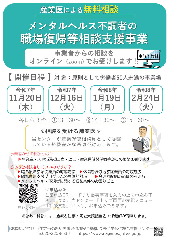 長野産業保健総合支援センターでは、労働者の健康保持・増進のため、 『窓口相談支援』、『メンタルヘルス不調者の職場復帰等相談支援』、『理学療法士等による職場訪問支援』を実施しております。
